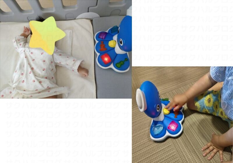 上の子と遊んでいるときに、下の子のそばに置いてあるおもちゃのボタンを押せば音楽が鳴って光ってくれます。