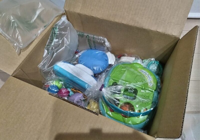 おもちゃが届いた時、一つずつおもちゃが袋に封入されており、更におもちゃ全体がプチプチの緩衝材で包まれていました。