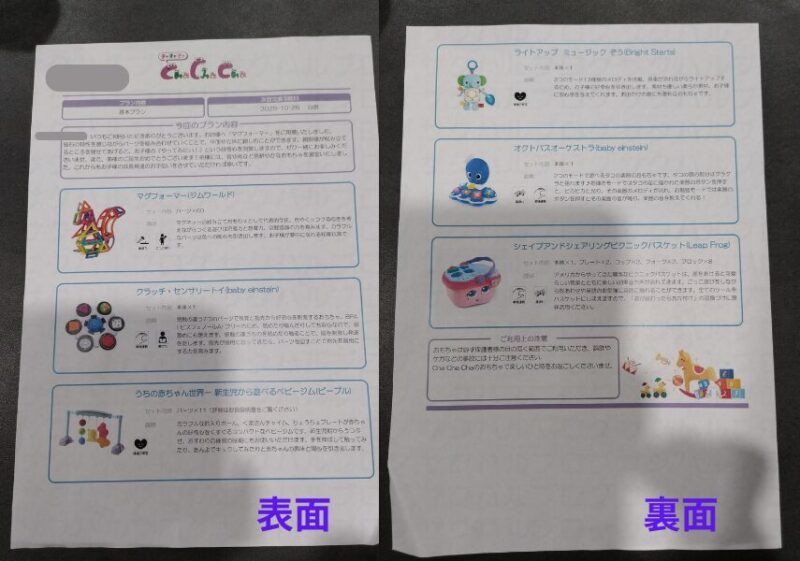 プラン内容の書かれたチラシを詳しく見ると、「次回交換可能日」「今回のプラン内容」「個々のおもちゃの説明」「ご利用上の注意」が記載されています。