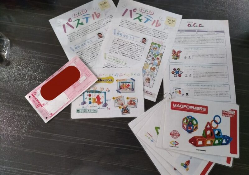 紙ファイルの中には着払い伝票、各月齢向けのお便り、おもちゃの説明書、プラン内容の書かれた書類が挟まれていました。